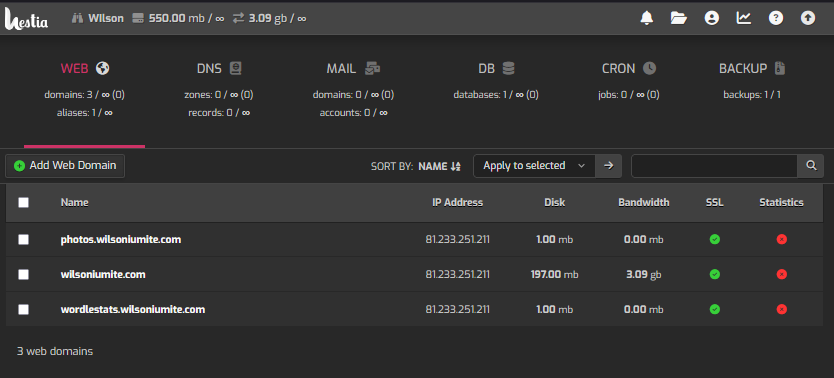 I wanted some way to host a blog and originally set up hestia to orchestrate the whole thing. It’s a bit overkill for what I need (I don’t use DNS or Mail or lots of the other cool things, and I’m the only real user), but it works pretty well. From there, I manage 3 domains that point to different services.
